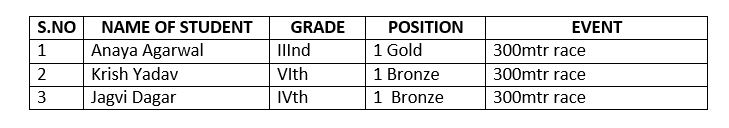 | S.No. | Name of Student | Class | Age Group | Event | Position |